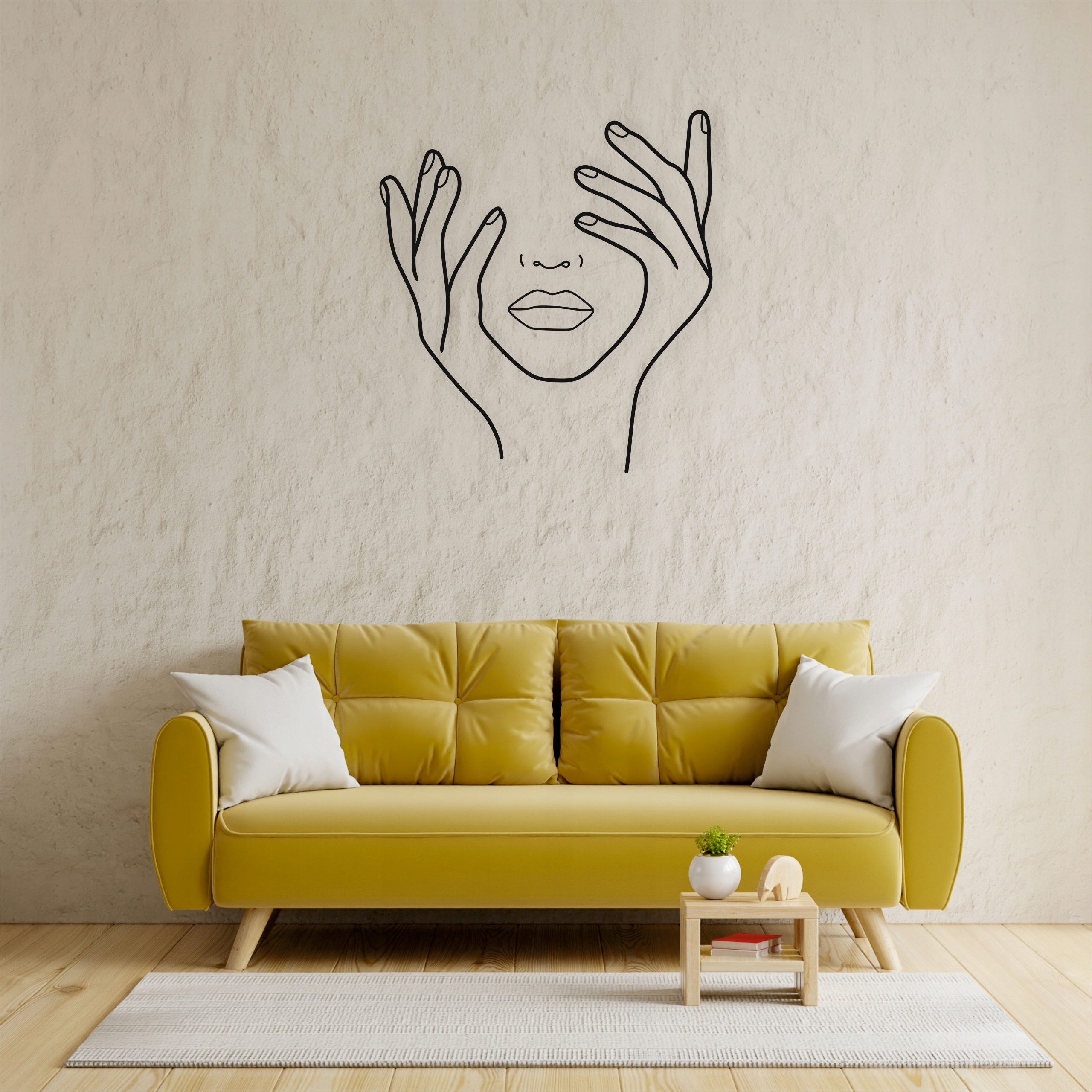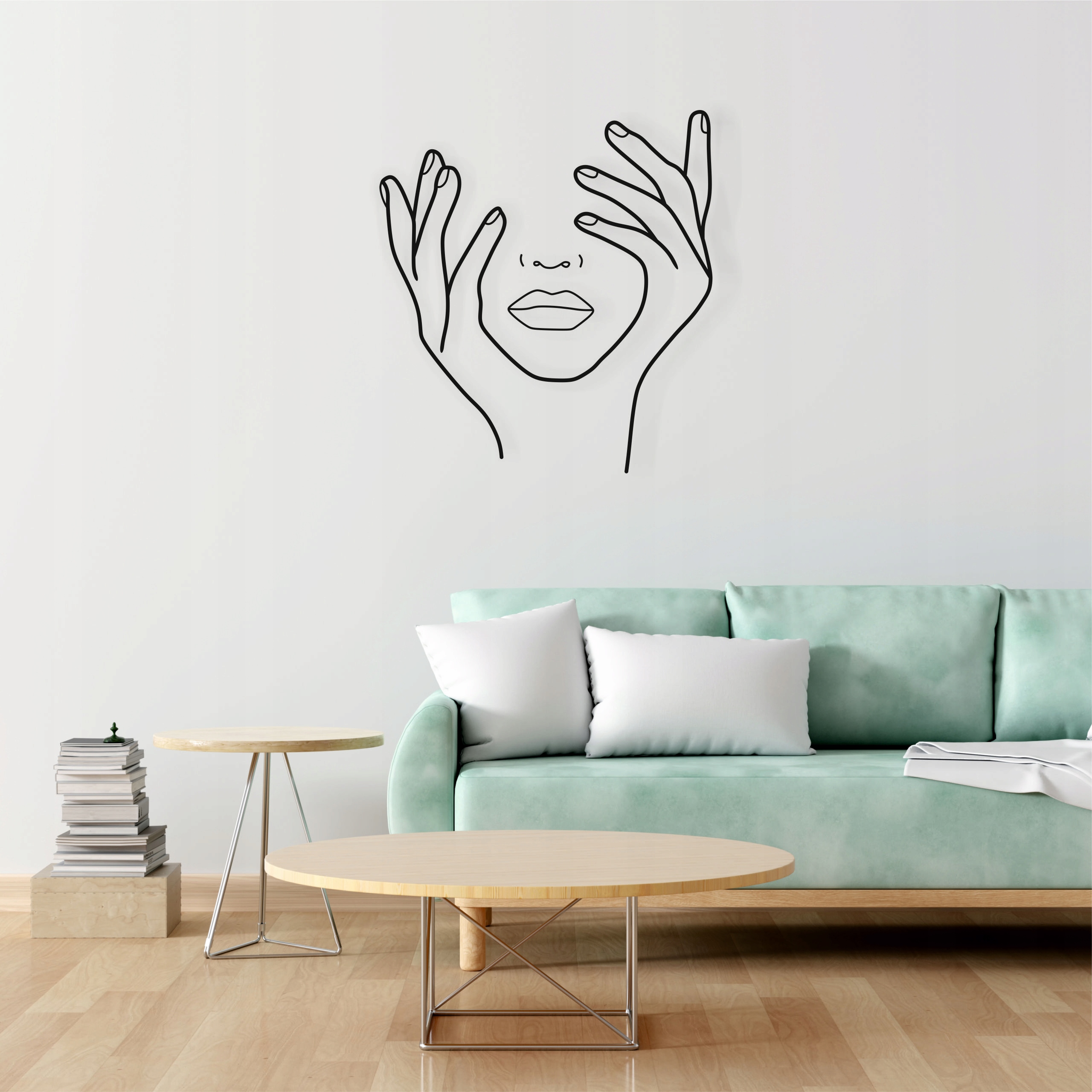 Ta dekoracja przedstawia minimalistyczny, linearny rysunek twarzy kobiety otoczonej dłońmi. Kontury wykonane są pojedynczą, płynną linią, co nadaje projektowi elegancji i nowoczesnego stylu. Usta i nos są delikatnie zarysowane, a dłonie układają się wokół twarzy w sposób subtelny i pełen lekkości. Całość ma artystyczny, nieco abstrakcyjny charakter, idealny do nowoczesnych wnętrz lub dekoracji w stylu line art.