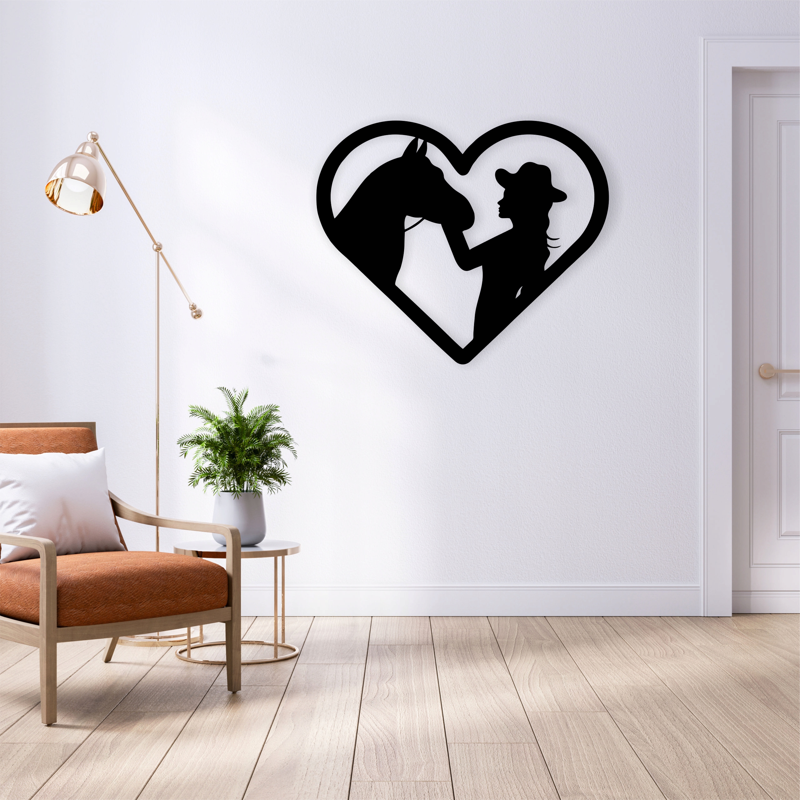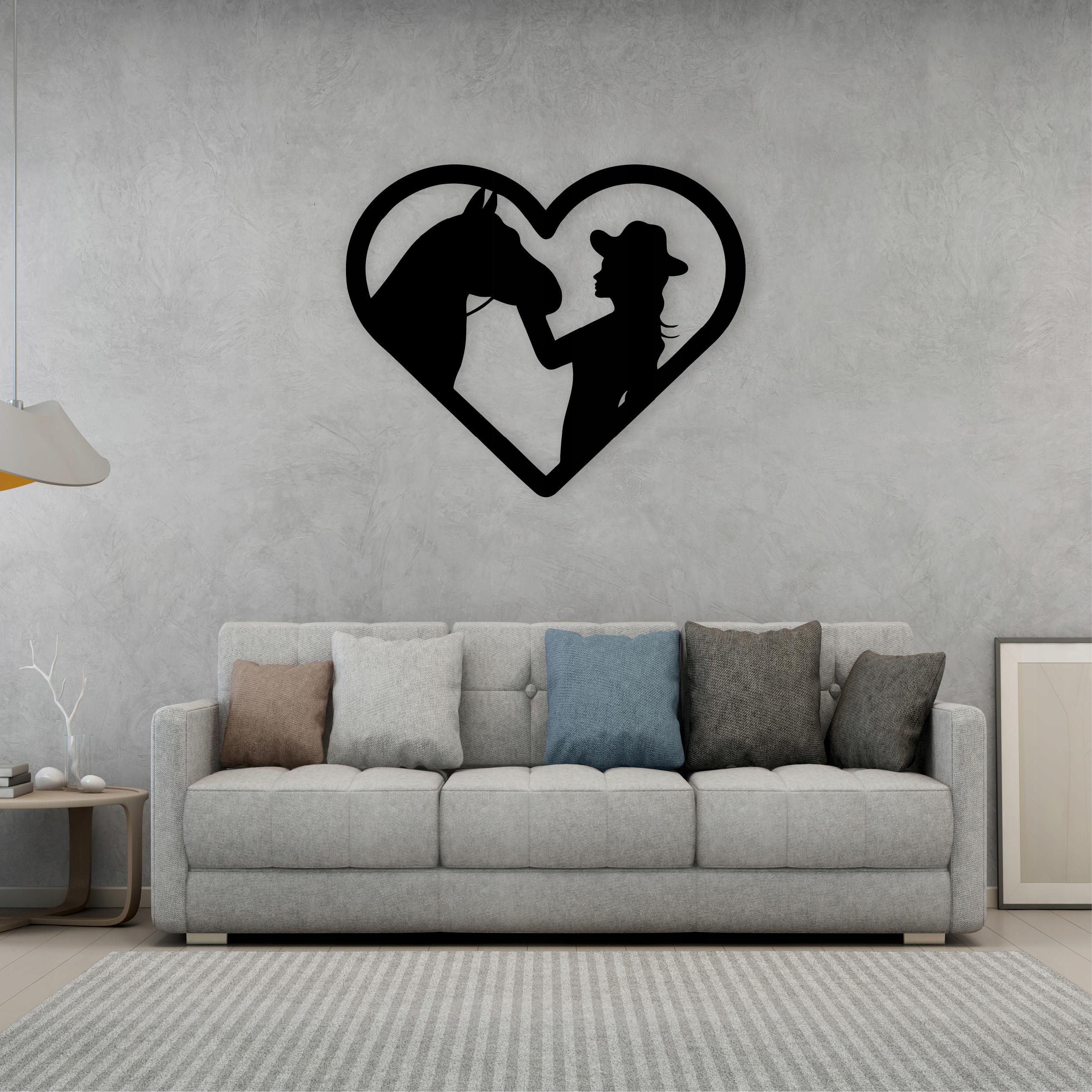 Dekoracja przedstawia sylwetkę konia oraz stojącej obok osoby w kapeluszu, ujętych we wspólnej, czułej scenie. Obydwie postacie wpisane są w kształt serca, co podkreśla więź, zaufanie i bliskość między człowiekiem a zwierzęciem. Proste, jednolite kontury tworzą elegancki, harmonijny motyw, idealny jako ozdoba dla miłośników koni, jeździectwa lub dekoracji o emocjonalnym, ciepłym charakterze.
